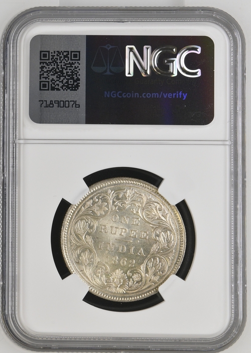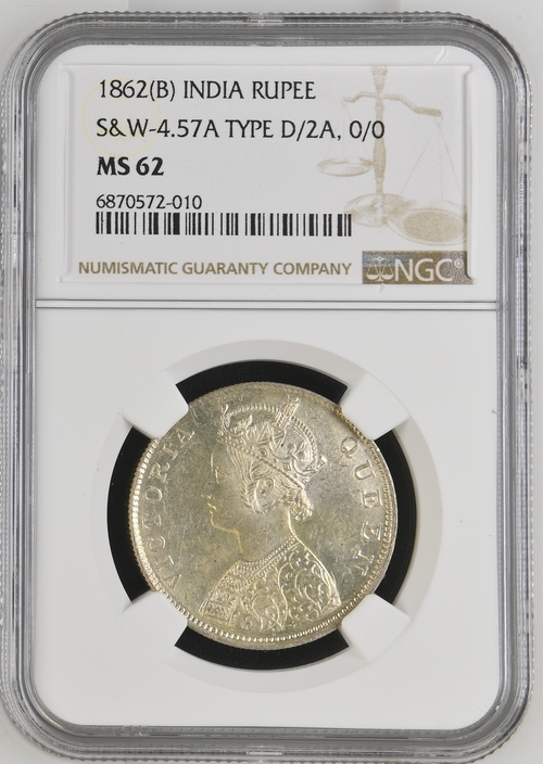 India 1862(B) Rupee S&W-4.57A Type D/2A, 0/0 NGC MS62