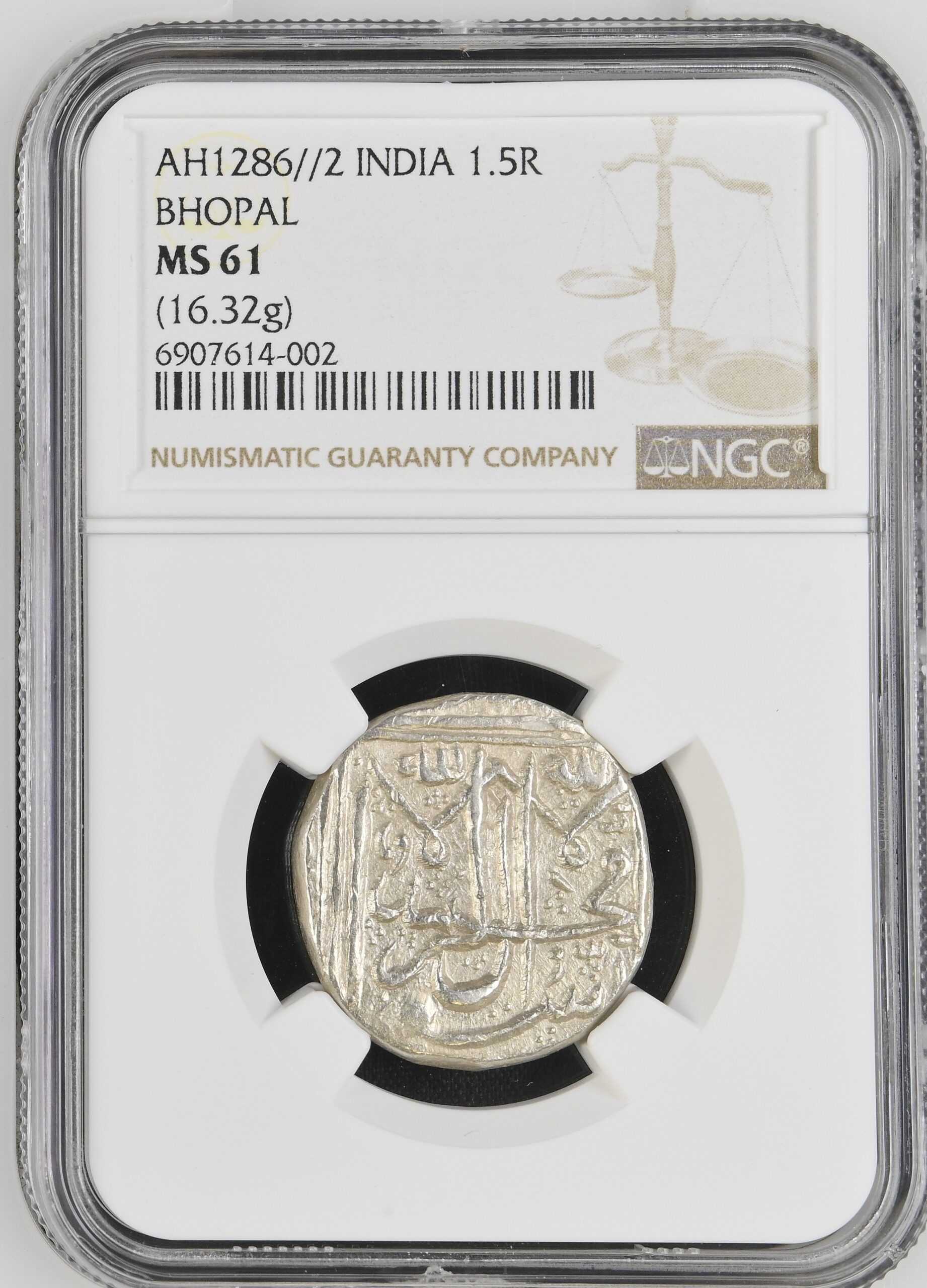 India AH1286//2 Bhopal 1.5 Rupee NGC MS61 – RRR