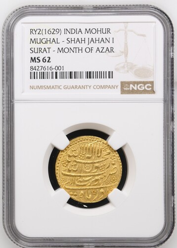India Mughal Empire 1629 RY2 Shah Jahan I Mohur Surat NGC MS62